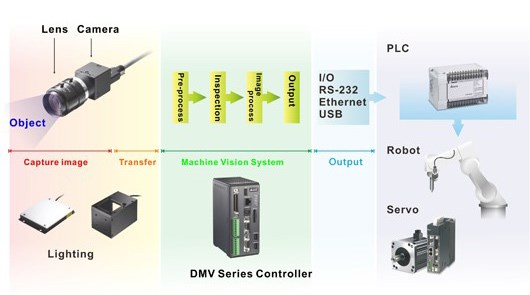 本系統主要是針對自動化生產線中,產品質量的瑕疵檢測、外觀尺寸測量、工件計數、識別確認以及自動化對位組裝等多項視覺檢測功能與需求而開發出來的產品,其檢測功能包含有『面積檢測』、『邊緣位置、寬度、角度、計數』、『瑕疵及斑點檢測』、『圖形比對、輪廓比對』、『字符識別』、『坐標、角度運算』、『尋邊測量』、以及『自動對位、坐標搜尋』等;用戶可以通過DMV控制器內部高速精準的多任務運算處理能力、人性化的操作界面以及多樣化的視覺檢測功能,來解決在生產線因為操作人員疲勞或疏忽造成的誤判,或是人眼無法識別出產品的缺陷以及因為高精密產品組裝不易等造成的各式各樣問題,進一步地全面提升生產線的產品質量、降低客退件數、增加設備產能以及減少企業的人工成本。